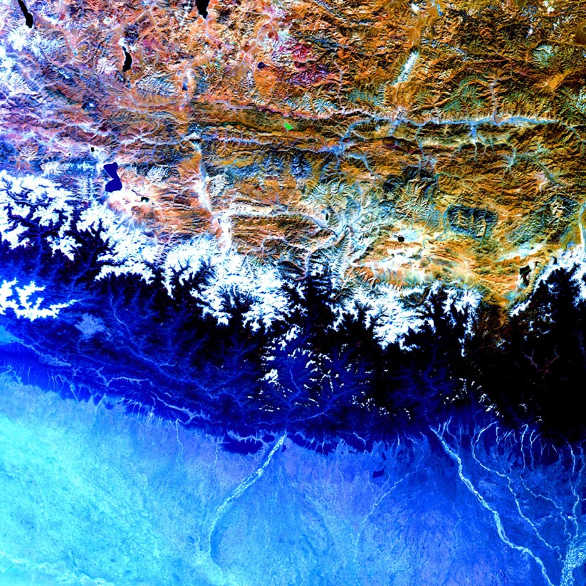 ■色鮮やかな地球の表面は、まるで芸術作品のようです。「しきさい」は非常に優れた感度で19種類の光を観測可能なセンサを持ち、250mの空間分解能で地球全体をくまなく観測しています。ちなみにエベレスト山頂は画像の中心からやや左の白い領域にあります。(K.T.)