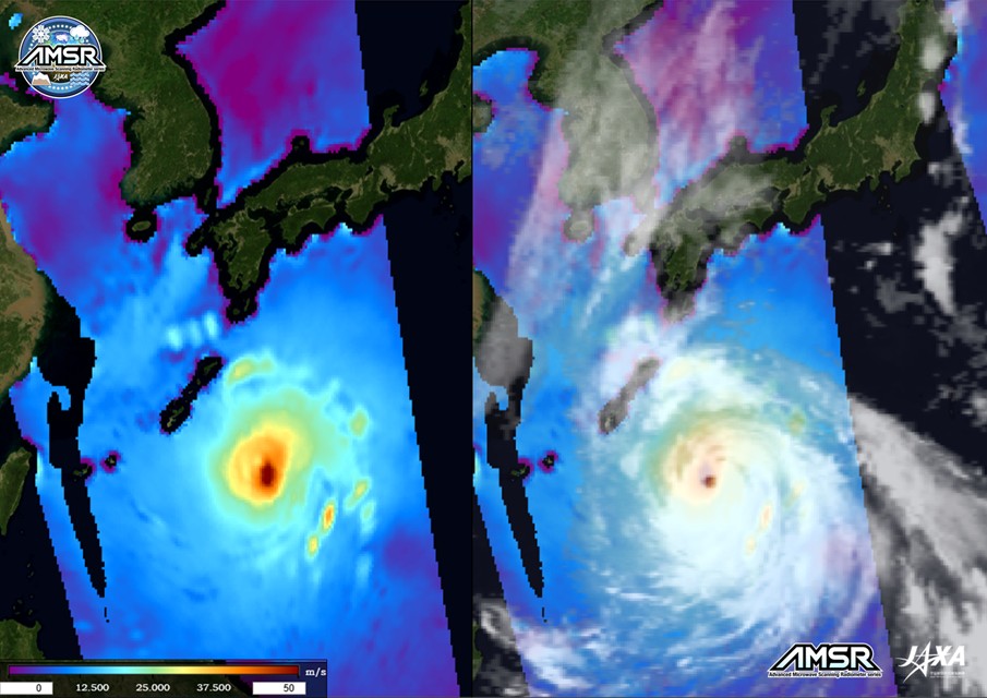 ■JAXAの高性能マイクロ波放射計(AMSR)シリーズは、厚い台風の雲を透過して海上を観測でき、台風直下の海上風速も捉えることができます。この画像は、AMSRによる先進的なマイクロ波放射計観測によるリモートセンシングの有効性を象徴する一枚と言えます。(K.A.)