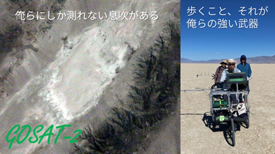 ■いぶき2号(GOSAT-2)は優秀な兄いぶきとともに地球の息吹を7年間観測し続けてきました。いぶきシリーズが長い年月を乗り越え、質の高いデータを提供し続けるためには校正がかかせません。校正の一つとして私たちは灼熱の太陽の中、自らの足でカラカラの砂漠を歩いて汗を流し、地球の息吹を感じ取っています。NASA JPLを始め、世界の輪を広げながら温室効果ガス観測を続けていくため、今日も私たちは歩き続けます。(R.K.)